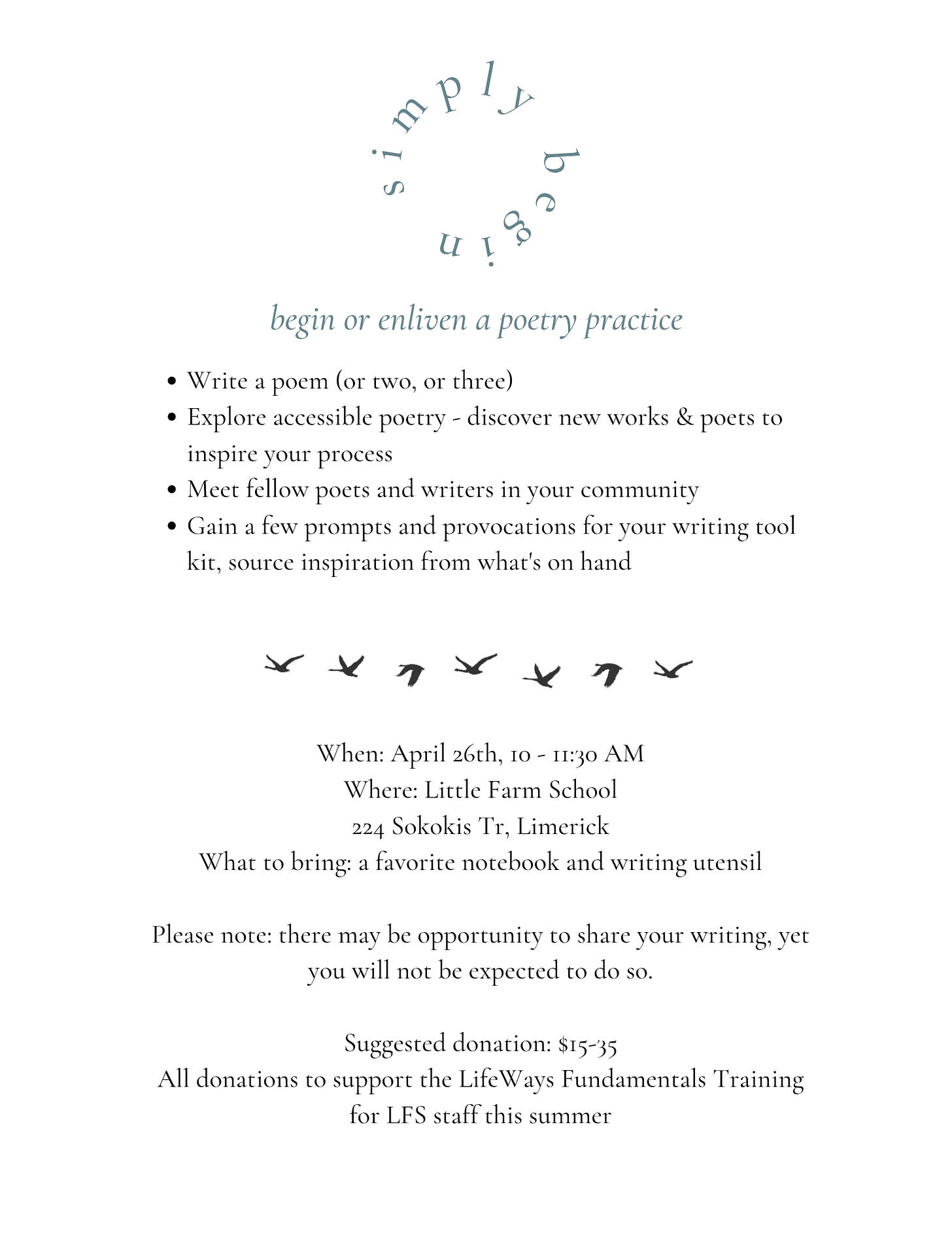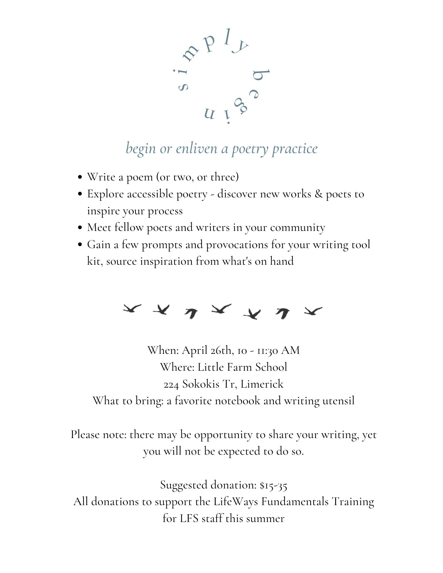 Suggested donation: $15-$35 - All proceeds to support Little Farm School staff in taking the LifeWays Fundamentals training this summer.
